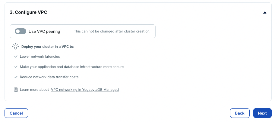Cluster setupページの下部には、VPCの設定を行う箇所があります。このハンズオンでは使用しませんので、[Use VPC Peering] をオフにしたまま、[Next]をクリックしてください。